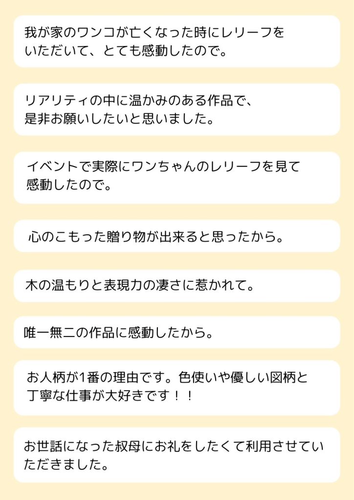 ここに挙げているのは一例ですが、他にもこれまでたくさんのお客様が様々な想いをもってこのワンちゃんレリーフをオーダーしてくださいました。