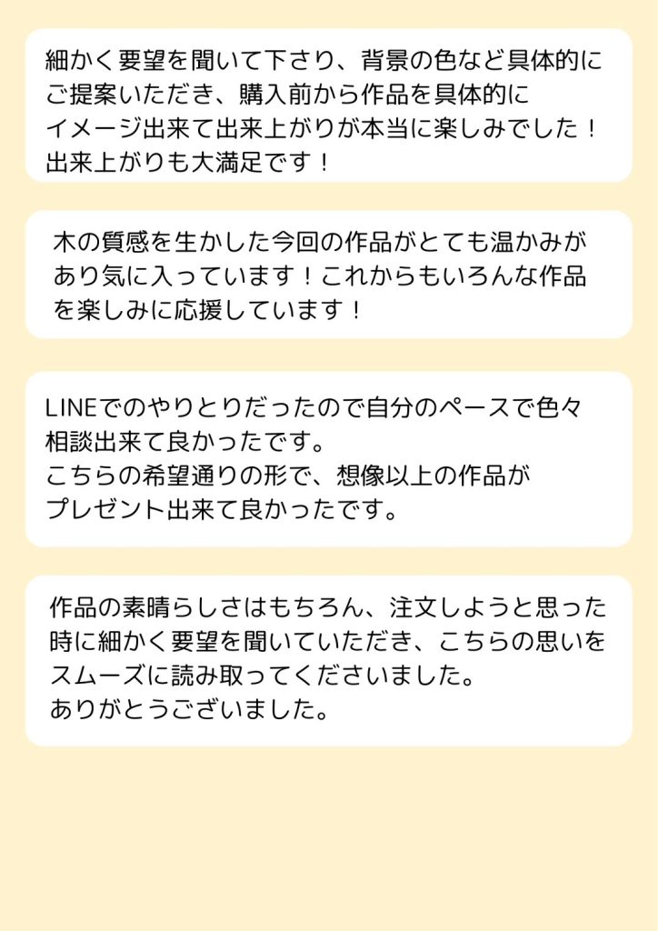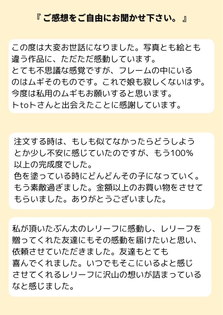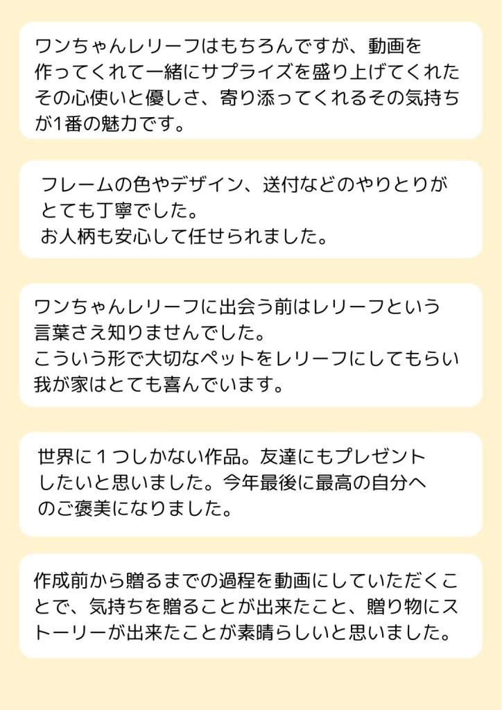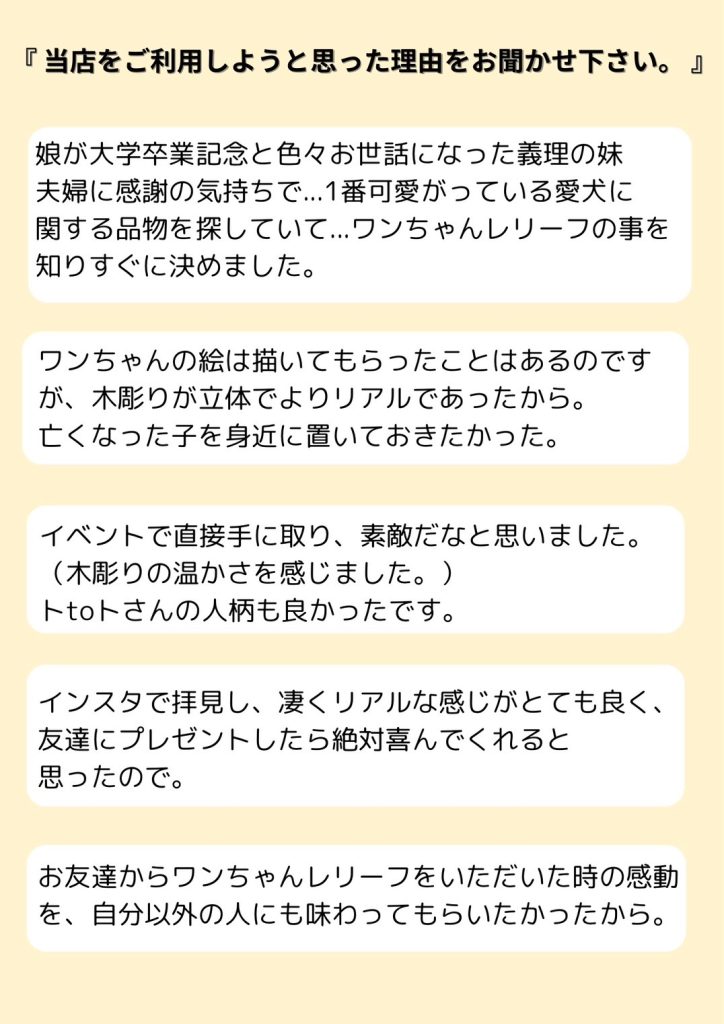 大切なご友人の誕生日プレゼントにワンちゃんレリーフを選んでいただけたことが本当に嬉しくて、もっと自分に出来ることは無いか。お客様の想いがご友人により伝わるにはどうすればいいか。